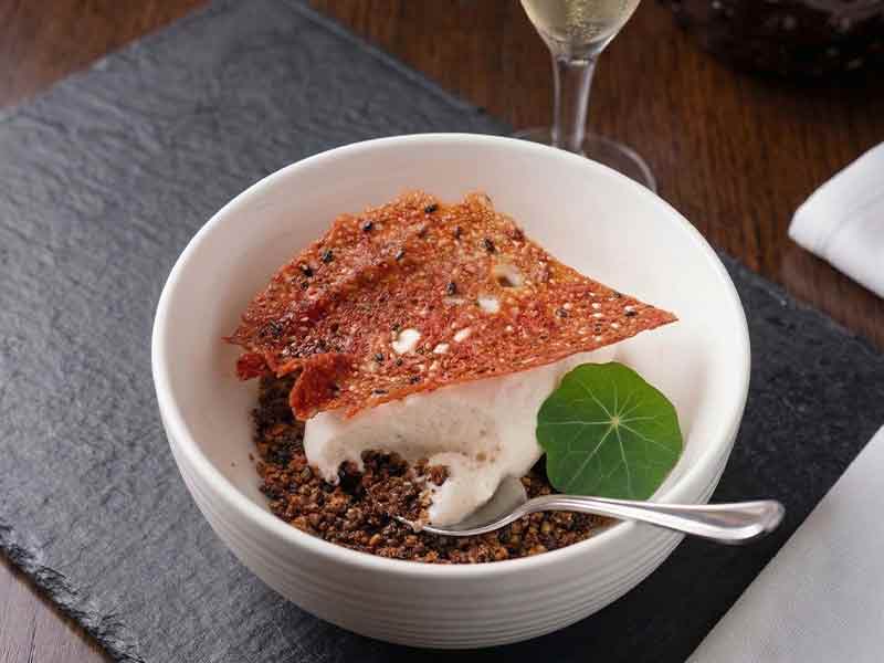 O quarto tempo, cumpre a função de uma pausa inteligente. O sorbet de limão com crumble de castanha de caju, tahine, compota de caju na cachaça e tuile de gergelim é uma montagem que oscila entre o choque térmico, a riqueza exótica e a brasilidade declarada. O Ponto Nero Celebration Moscatel envolve a acidez do limão com doçura floral, domesticando a potência aromática da cachaça sem apagá-la.