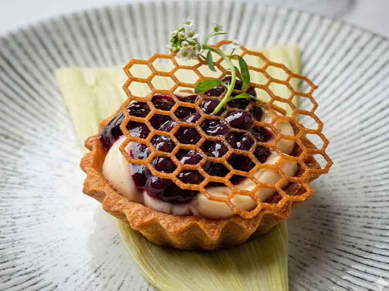 O segundo tempo é um aceno direto à afetividade alimentar brasileira. A tartelette de milho crocante com creme de queijo artesanal e geleia de jabuticaba evoca a roça sem cair no pitoresco. A crocância da massa quebra a maciez do creme, e a acidez da jabuticaba equilibra o conjunto, impedindo que a doçura do milho se torne pesada. No topo, uma tuile em formato de colmeia cria geometria e leveza visual. O Espumante Casa Valduga 130 Brut eleva a percepção de frescor e dialoga com a acidez frutada da geleia com elegância.