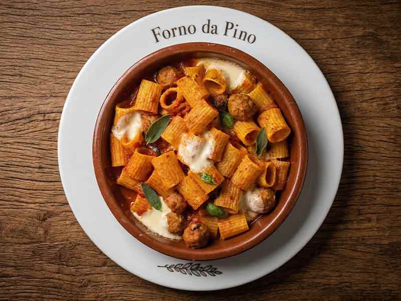 Há um momento em o Forno da Pino que qualquer mesa ao redor observa: quando o Maccheroni (R$ 92) sai da cozinha. O prato, servido dentro de um pão italiano que transborda queijo fontina e funghi, é rústico e absurdamente guloso de uma forma que desafia qualquer intenção de moderação. O Fettuccine Forno da Pino (R$ 98) chega logo atrás em apelo visual, mergulhado em taleggio, cogumelos, manteiga trufada e gema, com aquela crosta dourada e borbulhante que é impossível ignorar e muito difícil de compartilhar.