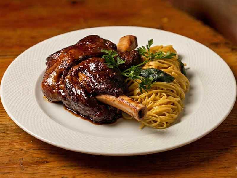 Quem chega até a seção de pratos principais de O Forno da Pino entende que a casa leva a cocção lenta a sério. A Spalla d’Agnello (R$ 136) é a prova mais eloquente disso: a paleta de cordeiro, cozida até atingir uma maciez que cede ao menor toque do garfo, chega à mesa com tagliolini fresco na manteiga e sálvia, um acompanhamento que perfuma o prato com inteligência sem disputar protagonismo. É o tipo de decisão que revela um chef que pensa no conjunto, não apenas no corte principal.